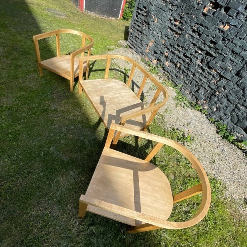 Два садовых кресла и диван изготовлены из массива березы и березовой фанеры. Глубокие и широкие уличные кресла и диван предусматривают размещение объемных подушек для сидения и спинки, что позволит в полной мере насладиться отдыхом. Низкое размещение сиденья, устойчивость мебели, изогнутая спинка и удобные подлокотники – мы предусмотрели все детали для полной релаксации. А покрытие колерованным бейцем и полиуретановым лаком не только подчеркивает красоту березовой древесины, но и надежно защищает террасную мебель от капризов природы.