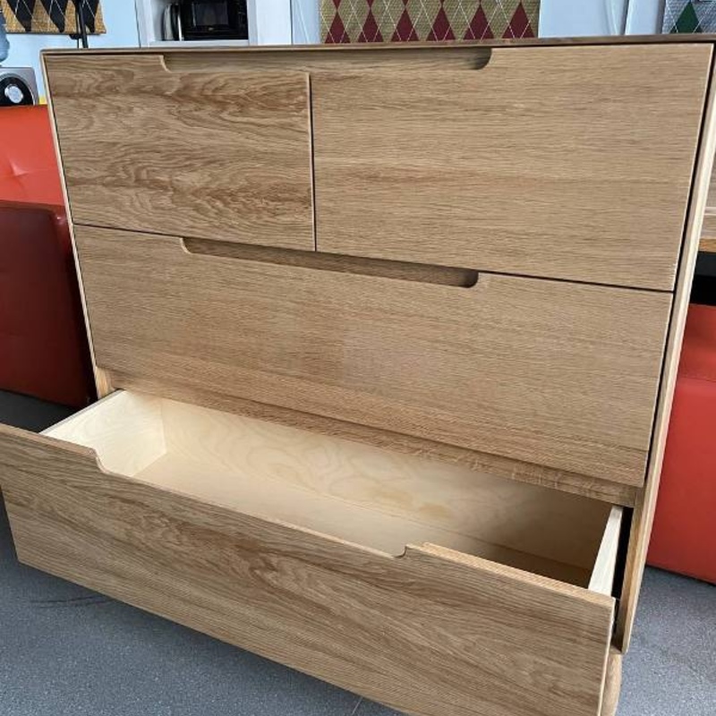Комод выполнен из массива дуба и имеет простую лаконичную прямоугольную форму со скругленными безопасными краями. Нарочитая простота фасадов акцентирует внимание на уникальной и узнаваемой фактуре дубовой древесины. Четыре выдвижных ящика, на направляющих с доводчиком, позволяют не только упорядочить множество вещей, но и сохранят тишину, закрываясь бесшумно. Особого внимания заслуживают инегрированные ручки ящиков – тактильные, удобные и идеально дополняющие стилистическое решение комода.